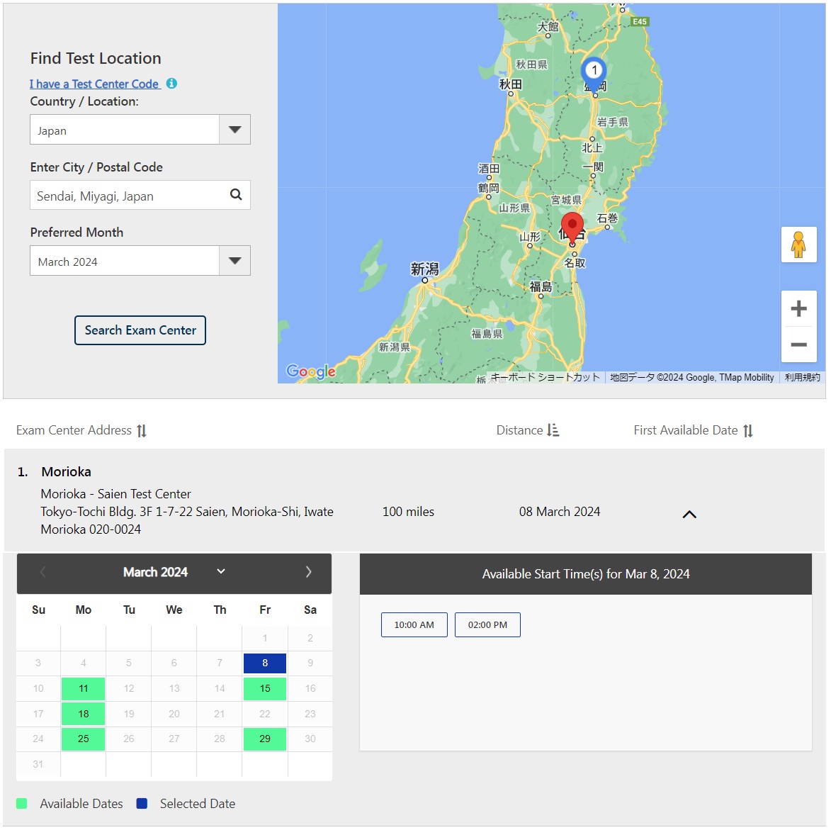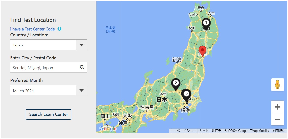 A7 まず、PSI社のWebサイトにアクセスする 【Secect Organization】 → [ISACA] を選択する。 【Select Test】 → [Certified Information Security Manager (CISM) ] を選択する。 【Delivery mode】 → [Test Center] を選択する。 【Find Test Location】 となるので、 【Countory/Location】 → [Japan] を選択する。 【Enter City】→ もよりの大都市名をローマ字で打ち込む。例えば sendai と打ち込むと、[Sendai, Miyagi, Japan] と自動的に補完される。 【Preferred Month】 → 受験したい月を選ぶ。 地図上に@、A、Bのように受験施設が表示される。 ![]() 例えば@の盛岡をクリックすると、盛岡テストセンターの受験可能日が緑色で表示される。 ![]() |